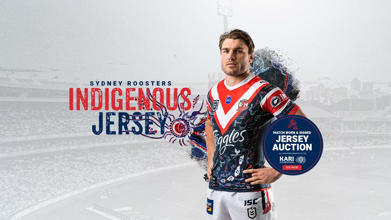 Sydney roosters club is depicted as the main circle. Indigenous jersey auction on now. All proceeds will be donated to the kari foundation to support sydney roosters community programs.